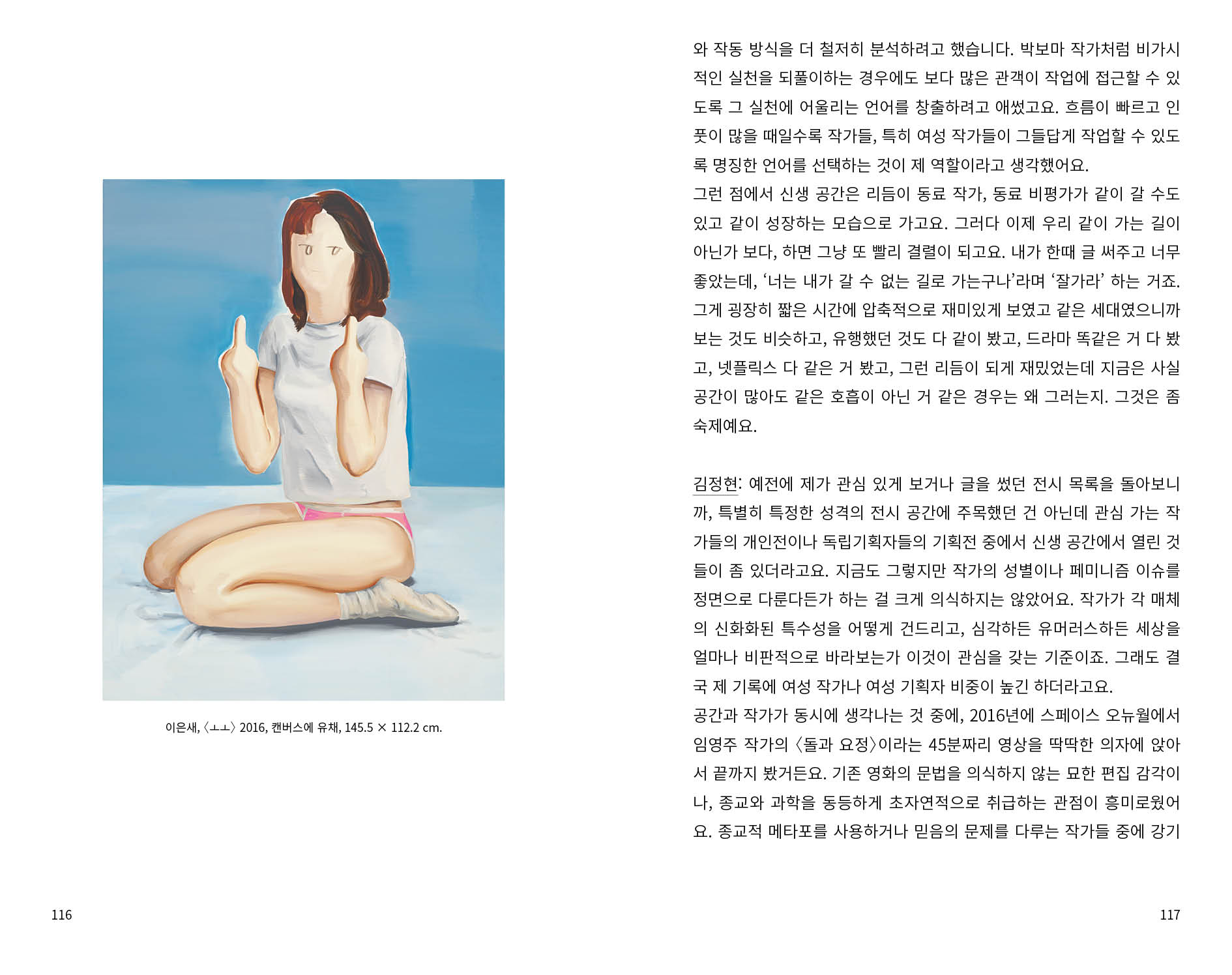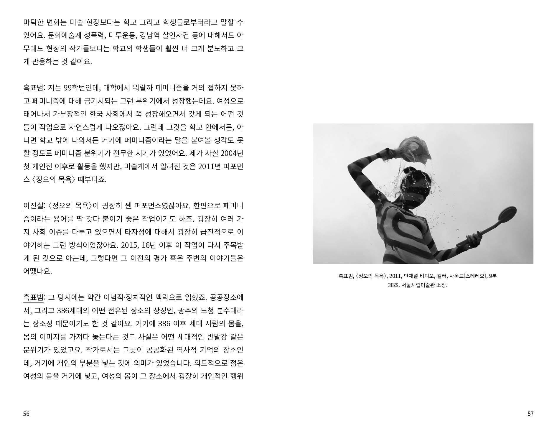 “다른 한편에서 목격하게 되는 것은 과거 페미니즘 미술로부터의 단절이에요. 최근 미술대학 졸업 전시에서 여성 작가의 치열한 고민들이 눈에 띄는데, 8, 90년대 페미니즘 미술 작업과 유사한 모티프나 소재가 자주 등장합니다. 오마주처럼 보이는 작업도 종종 있는데, 작가들의 입장에서는 자신의 내밀한 경험에서 비롯된 것이라 설명할 때가 많아요. 물론 그렇겠지만 자신의 경험이 미술 작업이 될 때, 주요 상징물이나 매체가 갖고 있는 역사를 인지하지 못할 때 공회전의 함정이나 가장된 소외감에 빠질 위험이 크다고 봅니다.”