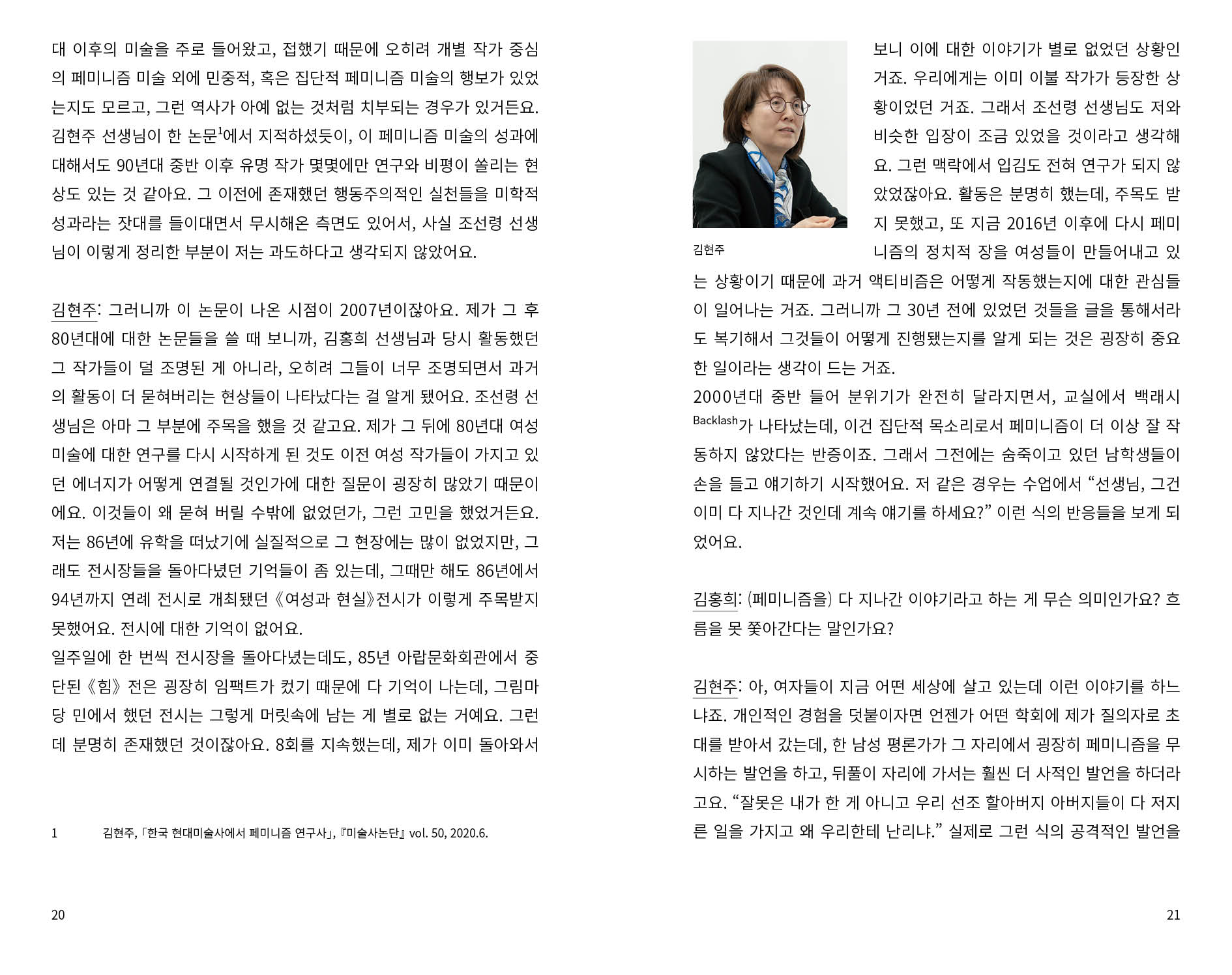 “여성작가의 전시를 연다는 것이 페미니즘 방법론이 가져온 큐레이토리얼이나 역사 읽기의 새로운 관점을 제 공한다기 보다는, 오히려 더 여성 비하적이고 혐오적인 관점을 양산할 뿐 이지는 않나 생각이 드는 거죠. 그러니까 인식론의 구조나 성별의 규범적 이해 등을 넘어서지 못한 채, 여성을 계속해서 피해자라는 존재로 규정하 기 위해 여성작가의 전시가 열려야 한다면, 대체 언제 여성 작가의 주체성 과 고유한 형식적 도전들에 대해 말할 수 있게 되는 것일까요? 그럼에도 어쨌든 여성 작가의 전시가 아예 열리지 않는 것에 비해서라면야 계속 열 리는 게 훨씬 나을 거라는 생각은 하지만, 그것으로 충분한가요?.”