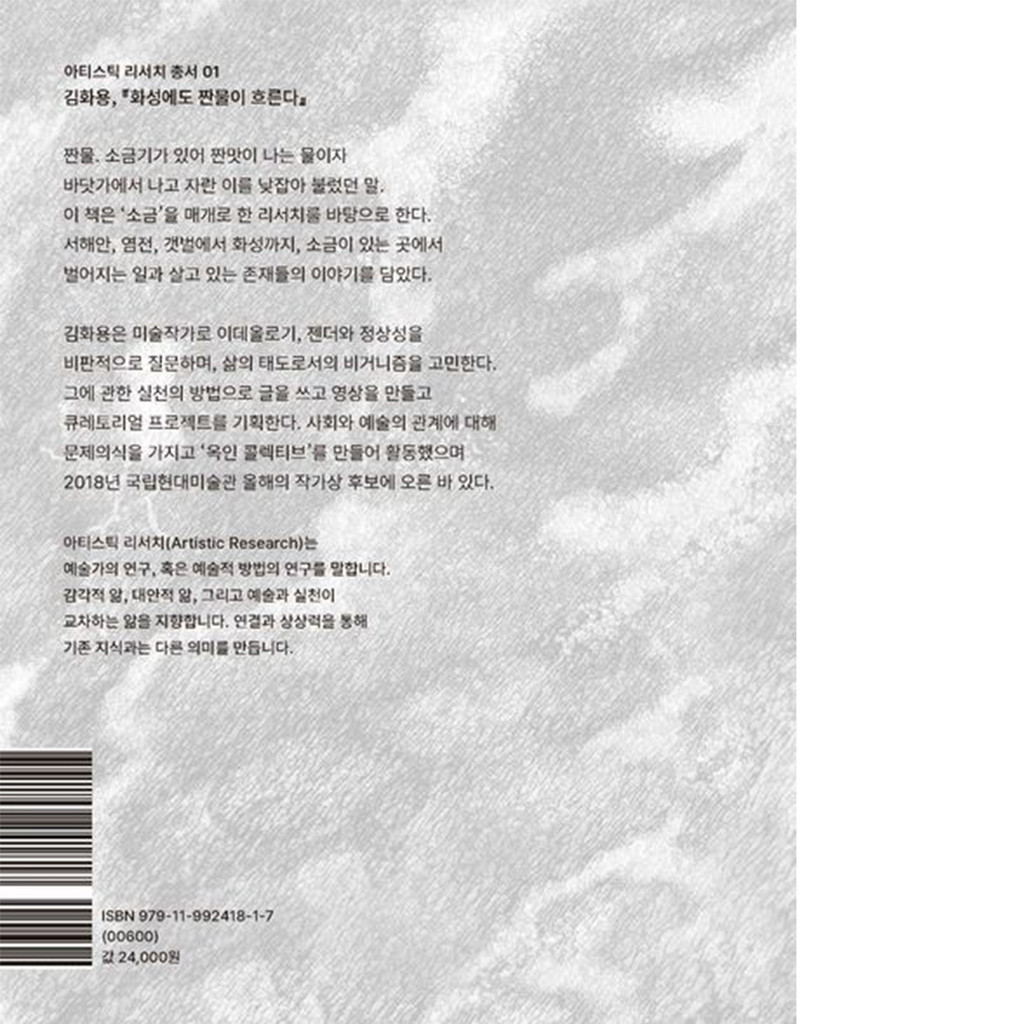 짠물, 소금기가 있어 짠맛이 나는 물이자, 바닷가에서 나고 자란 사람을 낮춰 부르던 말입니다. 『화성에도 짠물이 흐른다』는 인천의 '짠물'로 나고 자란 미술작가 김화용이 '소금'을 매개로 한 리서치를 바탕으로 쓴 책입니다.
