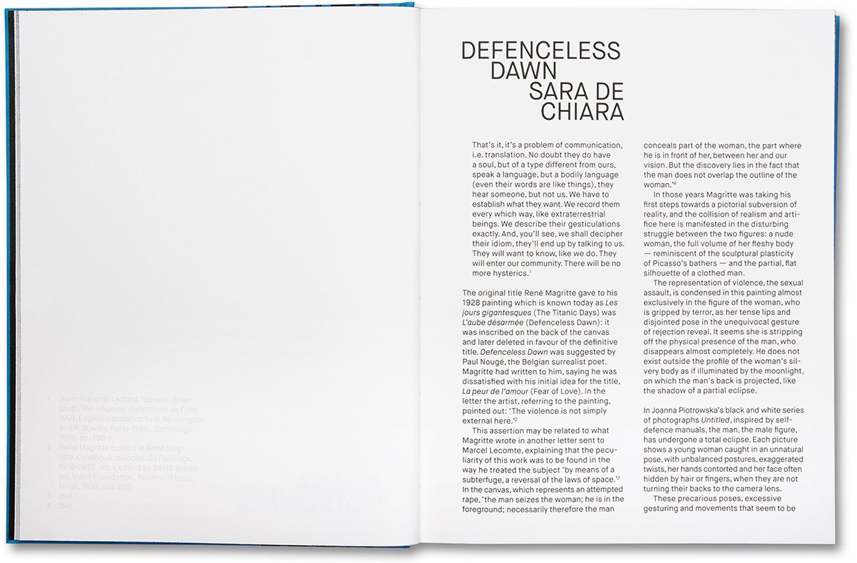 페이지를 넘기면 부자연스럽고 기이한 자세를 취한 여성들과 마주하게 됩니다. Sarah de Chiara의 텍스트를 통해 여성들이 자기 방어 자세를 재연하고 있다는 것을 알 수 있습니다. 공격의 대상이 사진 상에서는 부재하지만 이러한 과장되고 행위적인 몸짓은 보이지 않는 공격성에 대한 긴급함과 저항의 행위임을 암시합니다.