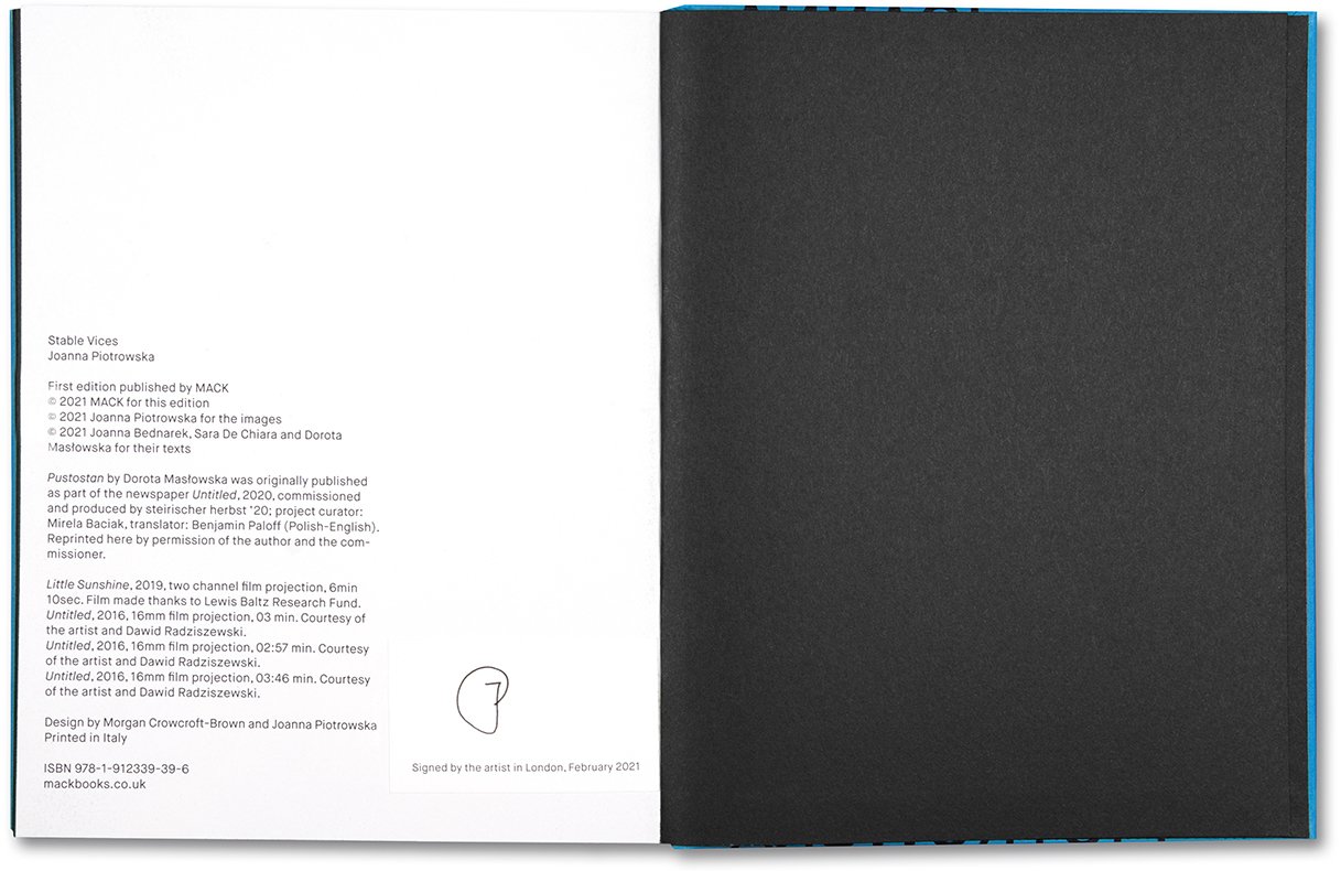 런던과 바르샤바에서 활동하는 폴란드 출신의 아티스트 Joanna Piotrowska는 사진 매체를 통해 힘과 잠재적 형태의 저항을 탐구합니다. 2021년 4월 MACK Books에서 출간된 <Stable Vices>에서는 보호, 자유, 억압을 주제로 한 세가지의 흑백 사진 시리즈를 선보입니다. Sara de Chiara, Dorota Masłowska, Joanna Bednarek의 에세이가 함께 실려있으며 다소 추상적인 사진 이미지들을 더 큰 맥락으로 확장시키고 있습니다. 책의 제목 <Stable Vices>는 마구간이라는 억압된 공간에 갇혀 배고픔과 운동 부족 등 욕구 불충족 상태에서 말이 취하는 이상 행동을 의미하는 용어에서 따왔습니다.